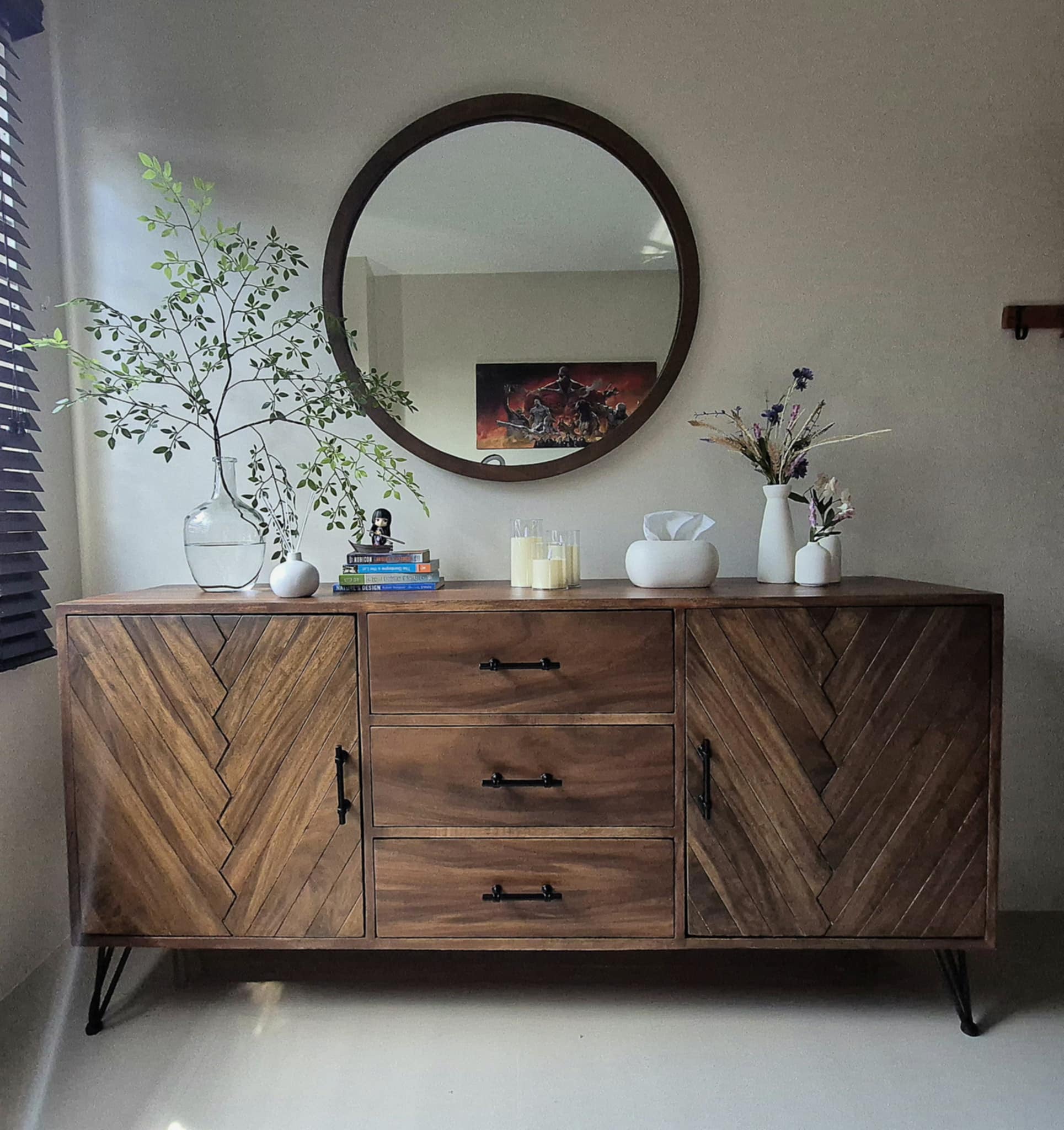 It offers ample storage for dinnerware, linens, and entertaining essentials. The wide tabletop provides the perfect stage for serving dishes, decorative accents, or your favorite wines.