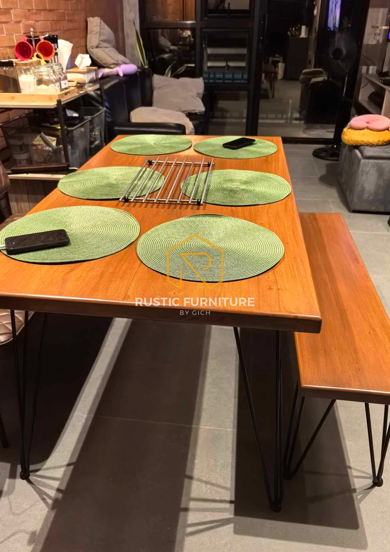 A solid dining table and bench with hairpin legs blends sturdy, rustic materials with sleek, minimalist design. Hairpin legs are a stylish and minimalist option for furniture, especially dining sets. A dining set with hairpin legs typically features a modern-industrial or mid-century design and the natural grain of mahogany wood pairs beautifully with the industrial look of hairpin legs.