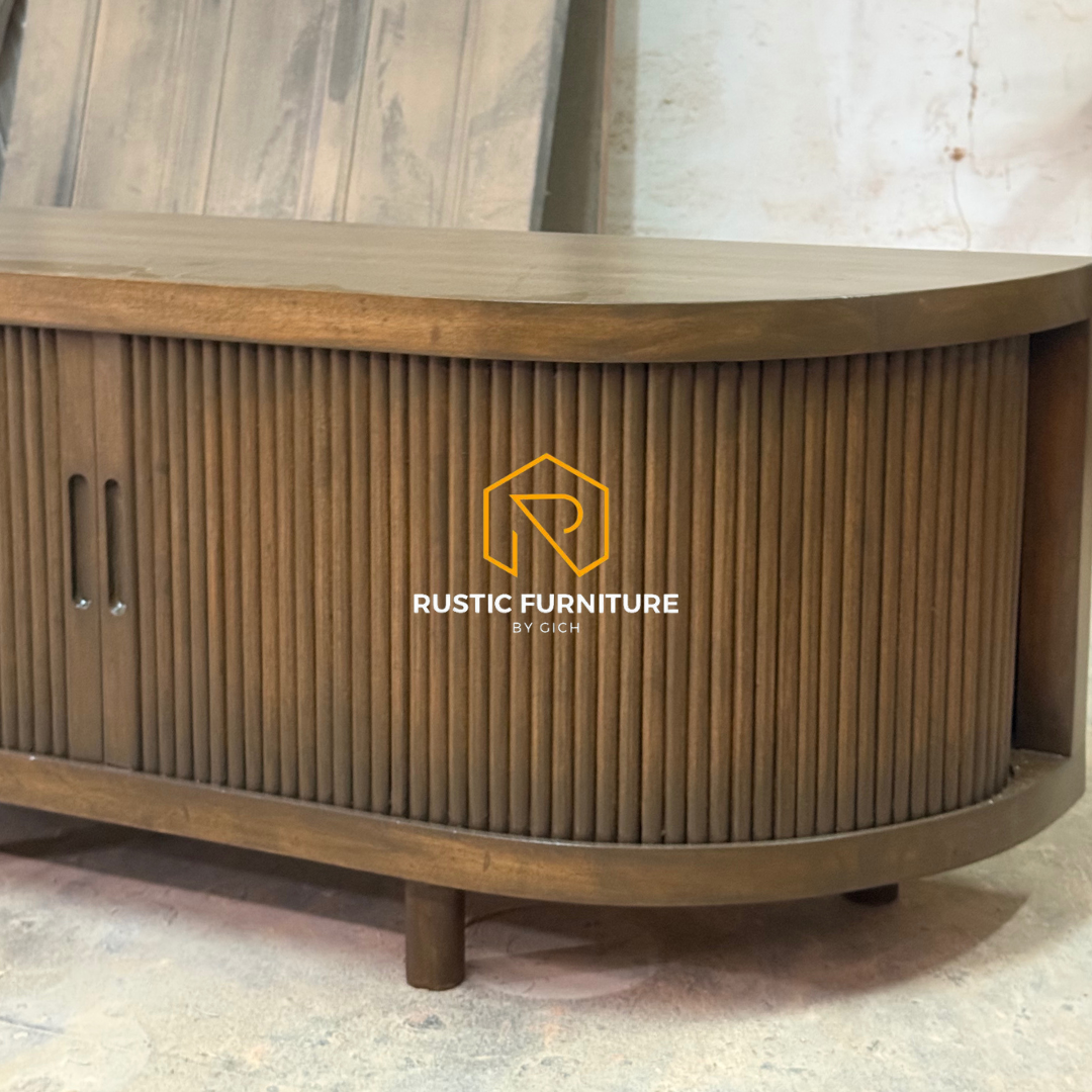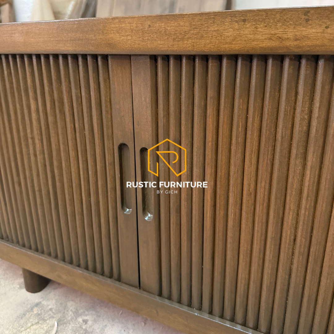 This solid console table has a stylish sliding door that allows access to storage compartments without needing swing clearance.